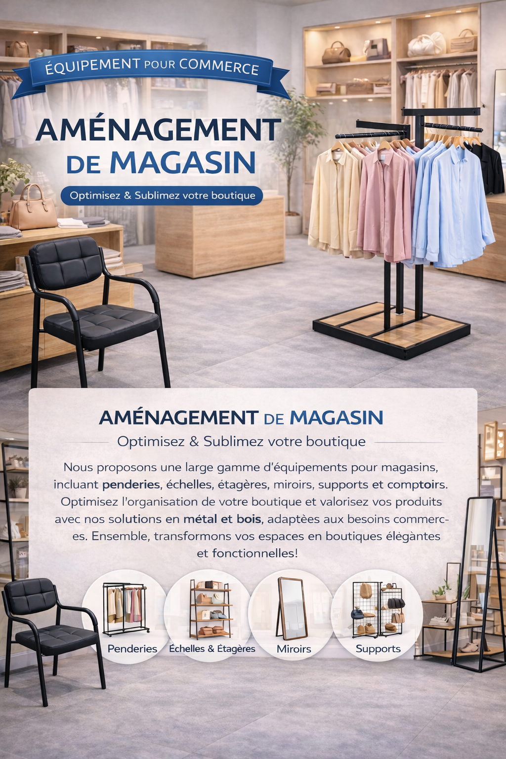 Que ce soit pour aménager une boutique, organiser un dressing à la maison ou équiper un espace de travail, Aménagement Pro DZ offre des solutions adaptées à tous les besoins.